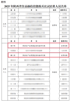 近日,陕西省市场监管局通报全省食品抽检技能练兵比试结果,陕西省质检院选派的魏宁果、解文斐两名同志凭借扎实的理论功底和精湛的操作技能,荣获检验组“优秀个人”奖。